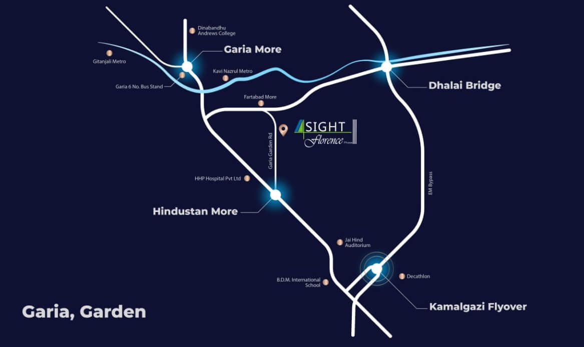 Buy 2 BHK, 3 BHK, Duplex, and Penthouse concepts in a Single Premium Tower of 4Sight Florence. It is the tallest Tower in Garia, Kolkata near Hindustan More. The site is almost 3 minutes away from Kavi Nazrul Metro Station. This revolutionary high rise residential project is perfect for families seeking unique, modern and elevated living. It is a pinnacle of luxury living designed for comfort and serenity with best panoramic city views.