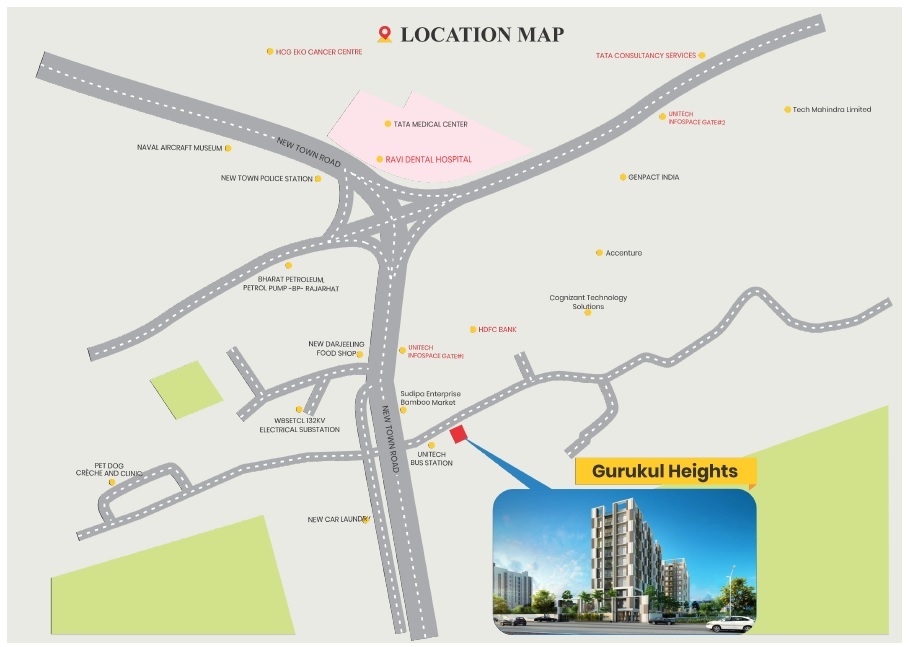Strategically located near Unitech Infospace Gate No.1 in New Town, Kolkata. Find 6 Parks, 5 Hospitals, 4 Shopping Malls and many more — around this projects. Gurukul Heights is minutes away from popular places like Aquatica, Eco Park, City Centre II, etc. This project is bound to please your expectations for sure.