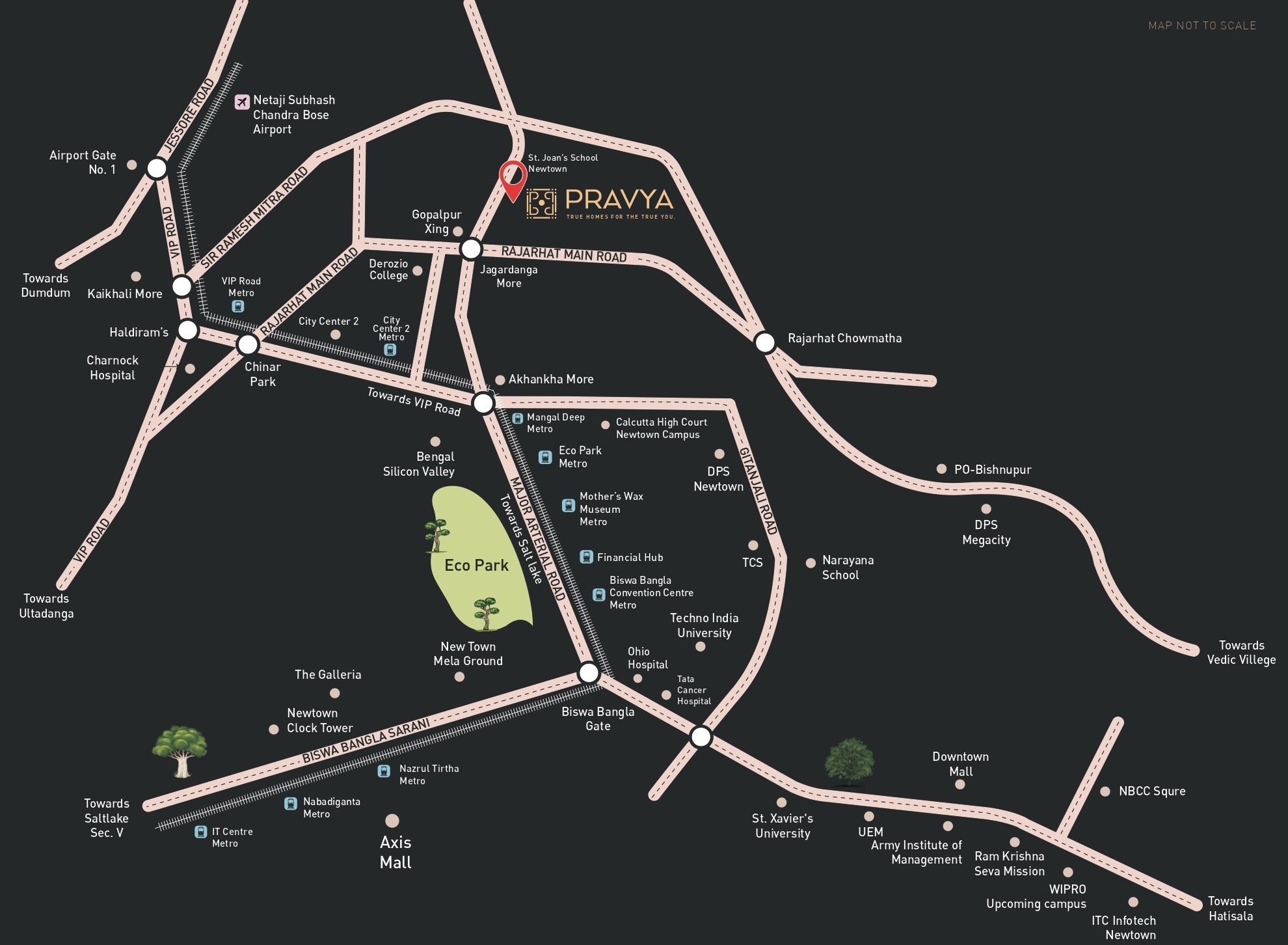 Pravya is conveniently located near 6 Lane Rajarhat beside St. Joan's School Newtown and offers easy access to key city attractions like Eco Park, Bengal Silicon Valley, and City Centre II. It is also close to popular transit points such as Chinar Park, Akankha More, and Mangal Deep Metro. Residents benefit from excellent connectivity to markets, schools, healthcare centers, IT hubs, and major city routes.